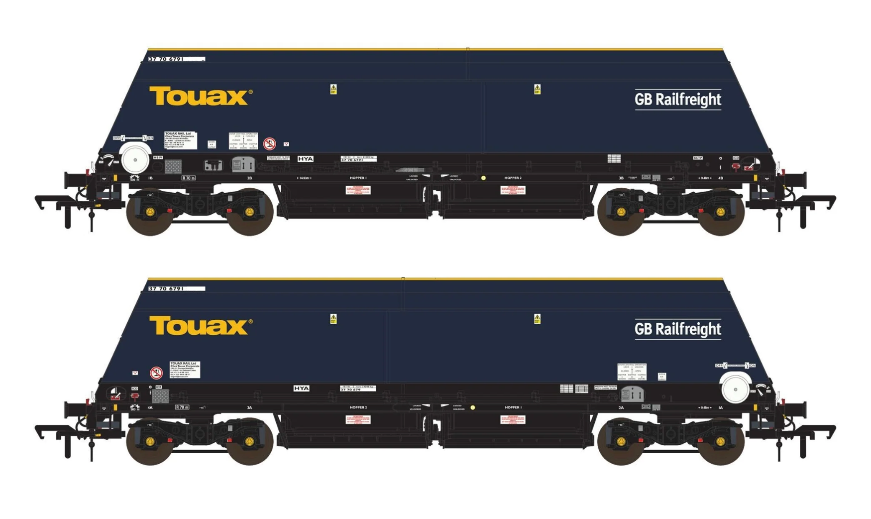 This pack contains two wagons Cutdown HYA -  Blue/Black with Touax/GB Railfreight branding  (Pack 3) HYA  37 70 6791 085-3HYA  37 70 6791 086-1 Common Features: Pack of two Wagons, each with...