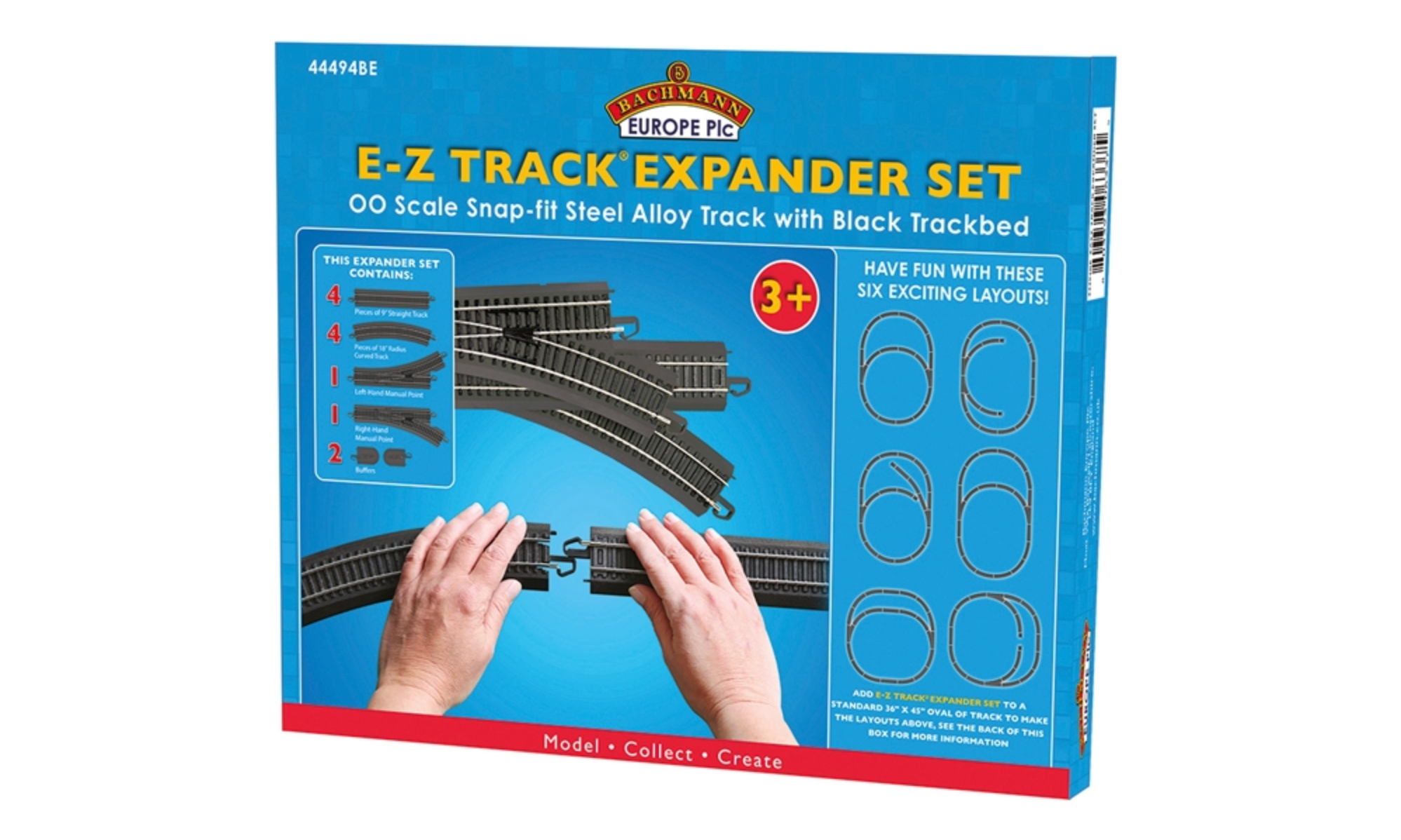 • 12 pieces of snap-fit E-Z Track®, including 4 pieces of 9” straight, 4 pieces 18” radius curved track, 1 manual turnout-left, 1 manual turnout-right, and 2 buffer stops