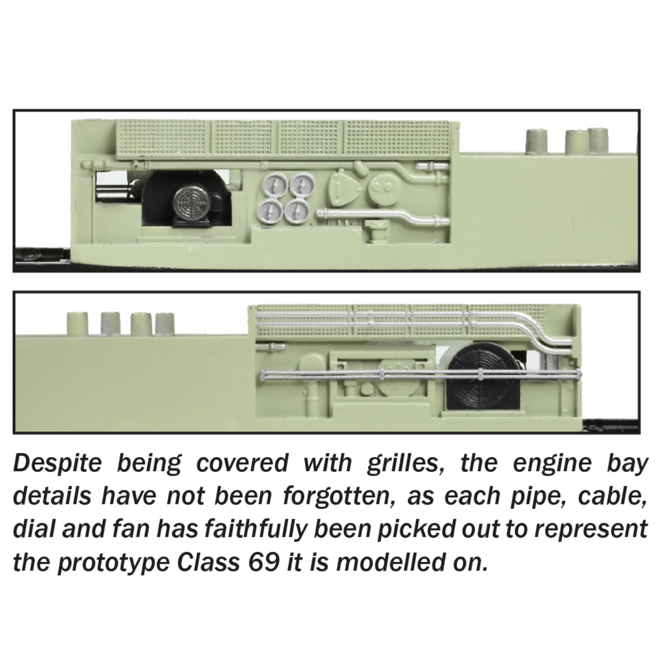• Precision moulded bodyshell and locomotive main frames, with numerous separately fitted parts including horn boxes, fuel tanks, battery boxes and sand boxes