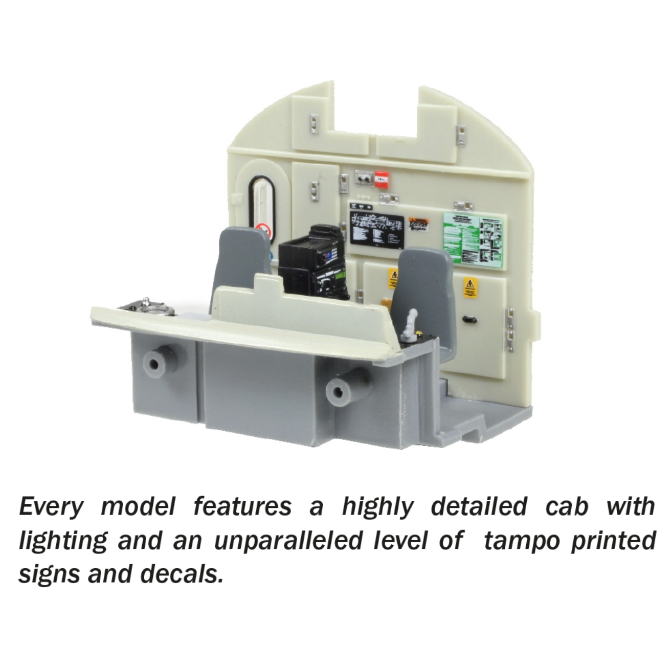 • Cab interior detailing which includes the control desk, cab seats, hotplate and rear partitioning and doors, complete with extensive interior decoration