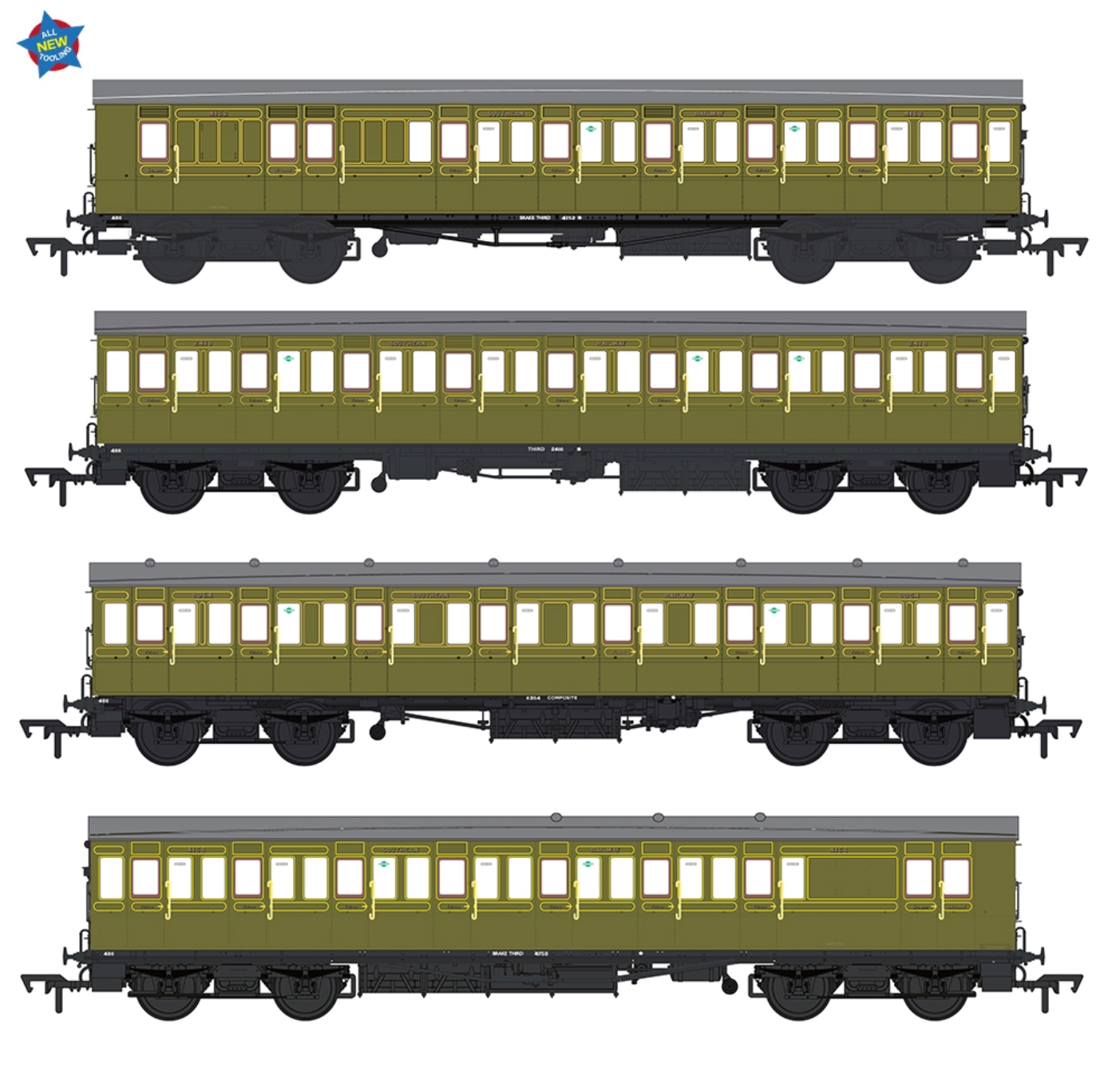 • 4-Coach Set comprising Brake Third Nos. 4152 & 4158, Third No. 2416 and Composite No. 6354