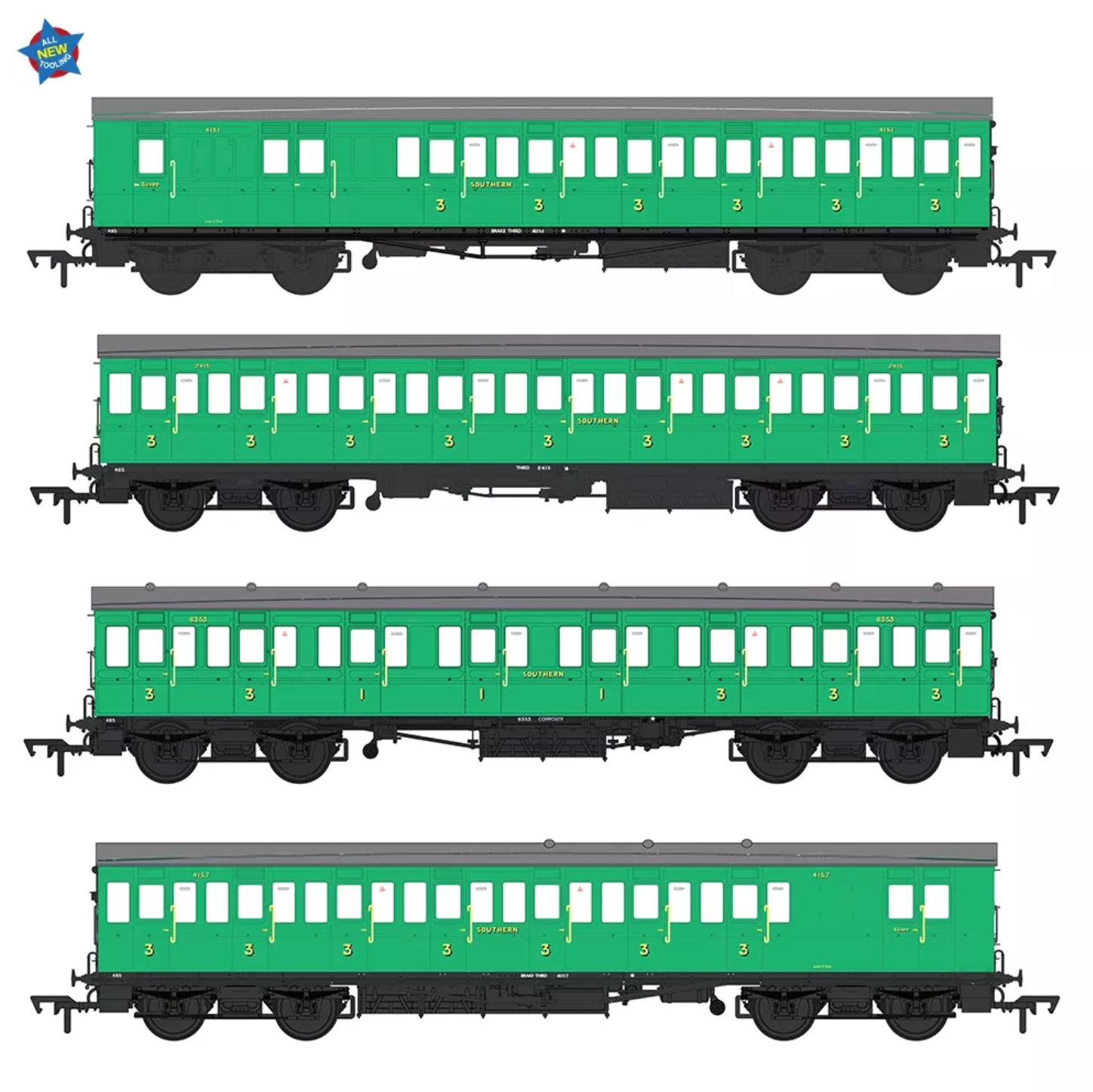 • 4-Coach Set comprising Brake Third Nos. 4151 & 4157, Third No. 2415 and Composite No. 6353