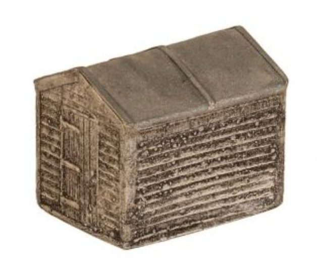 A nice little model of a small garden wooden shed, with a peaked wooden roof.