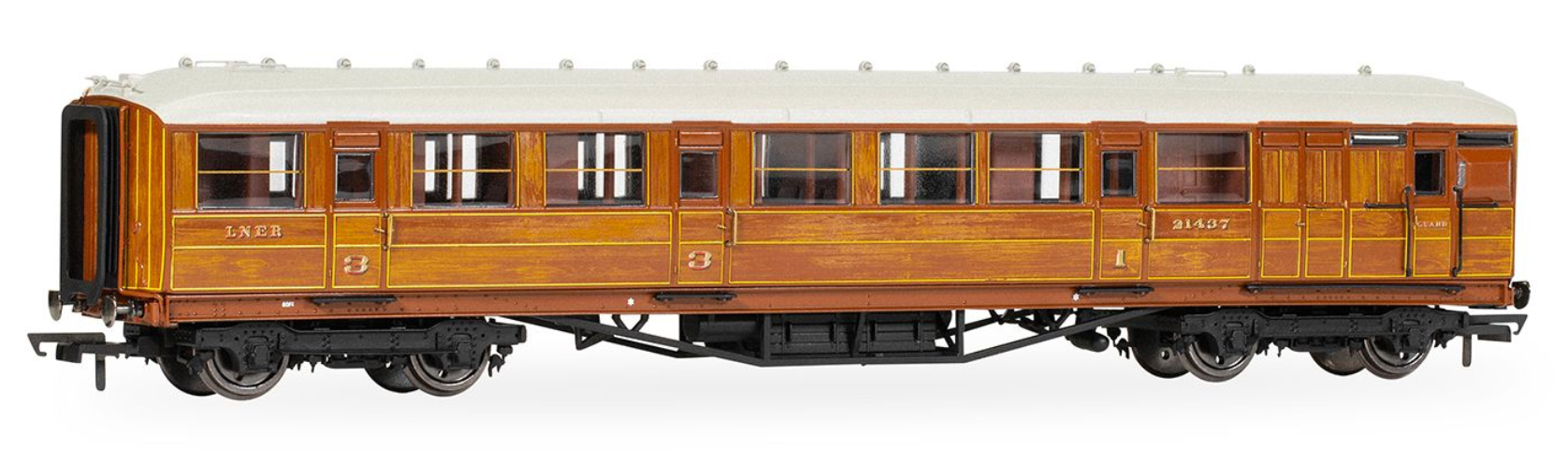 This highly detailed Gresley Corridor third-class Brake coach is presented in a varnished teak finish with printed decoration including the LNER branding, numbers ‘3’ and ‘1’ on the doors to mark the class of the compartment and its unique number 21437. The model has detail underneath and metal wheels for finer running.