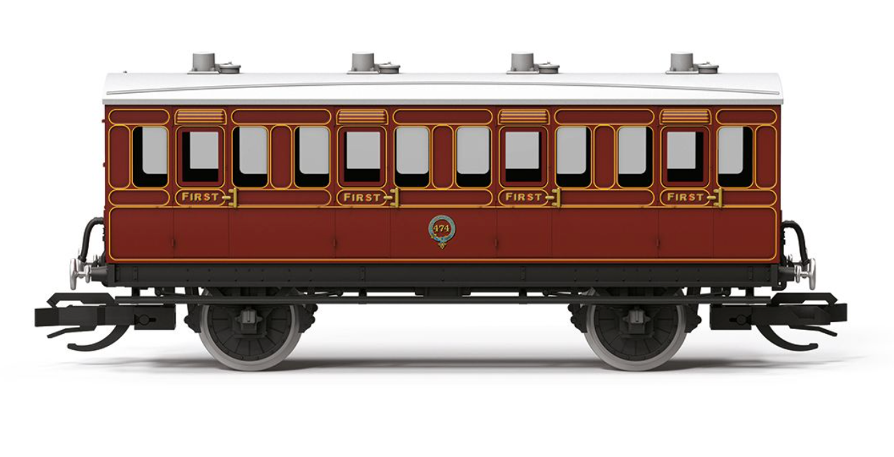 Hornby’s TT:120 LB&SCR First Class Four-Wheel Coach is finished in the dark red livery of the London, Brighton & South Coast Railway, with red-shadowed gold lettering.