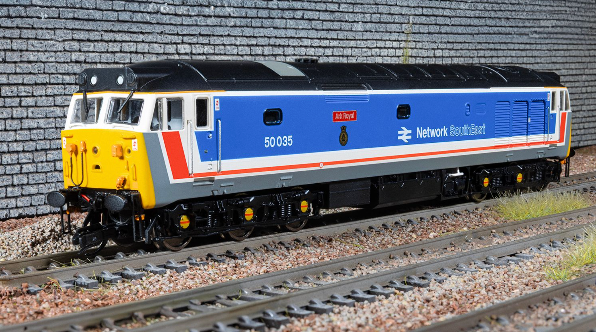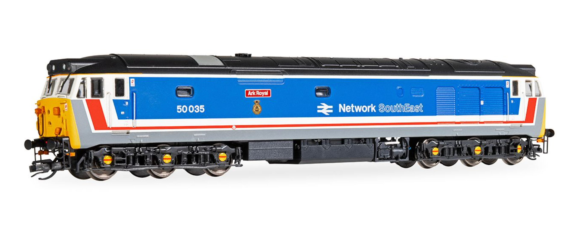 50035 ‘Ark Royal’ entered service on the August 1968. Built at the English Electric Vulcan Foundry and first allocated to Stoke devision under running number D435. This model represents 50035 in mid-1980’s condition in its classic NSE livery with Ark Royal nameplates.