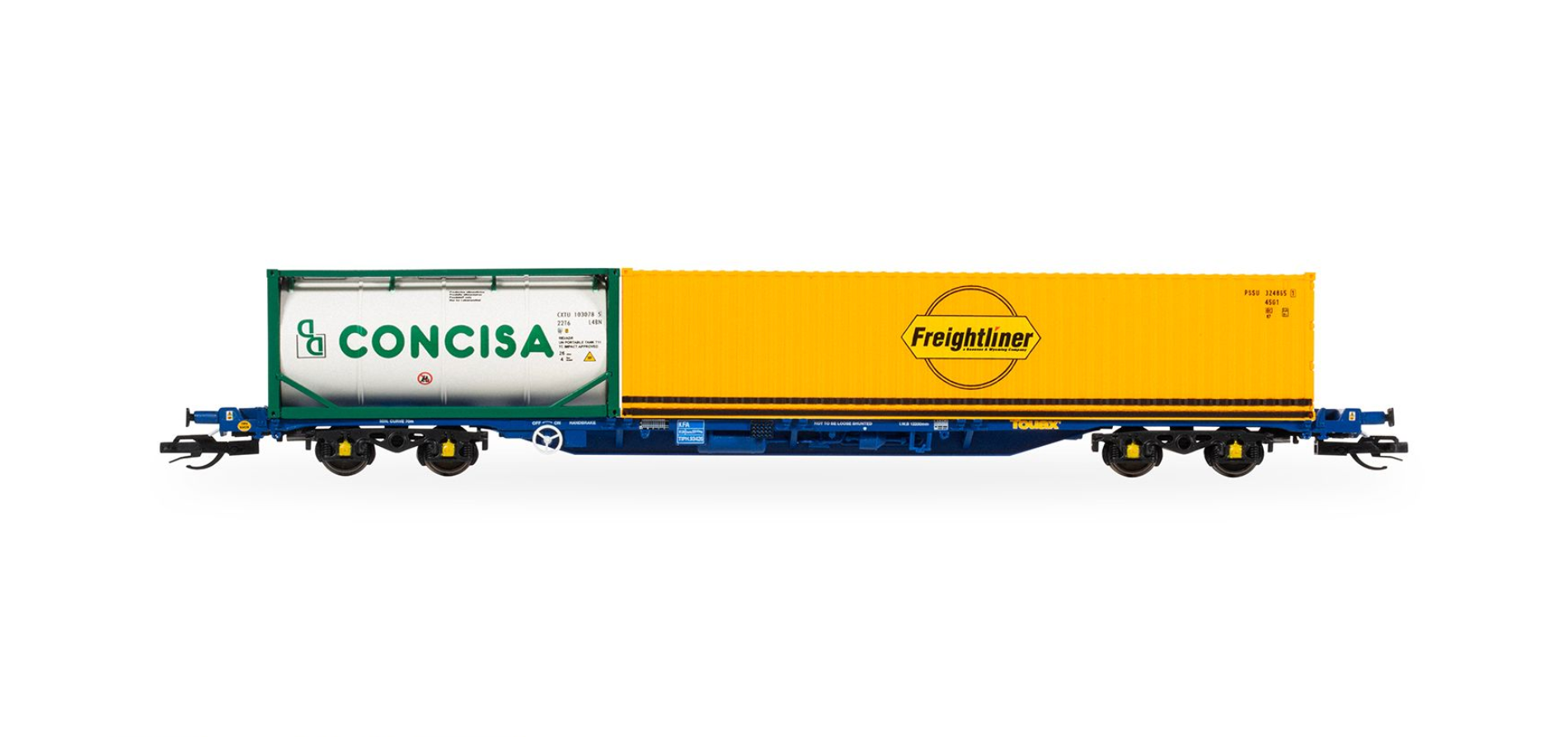 This version of the Touax container wagon exploits the KFA’s flexibility in having one 40ft-long container in the livery of Freightliner, and one 20ft tank container in the white livery of Spanish shipping company Concisa.