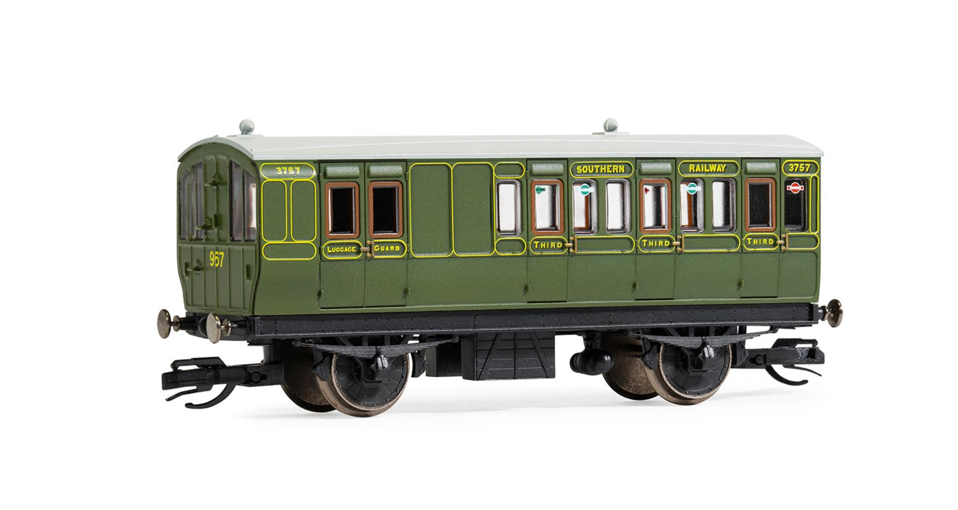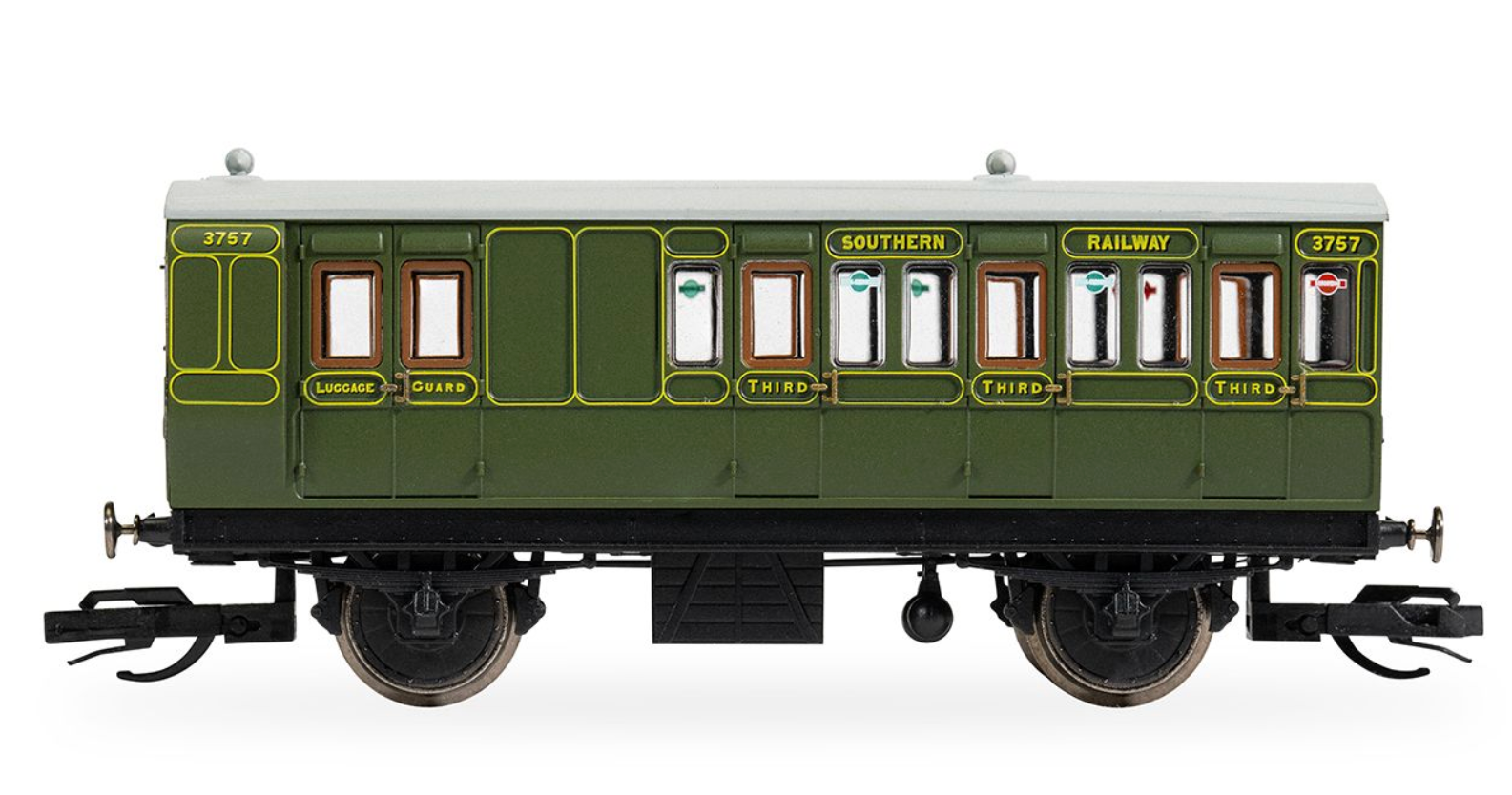 Hornby TT:120 SR Third Class Four-Wheel Brake Coach is finished in the classic SR green livery. This coach reflects the many four-wheelers inherited by the SR at the 1923 Grouping. Featuring Third Class seating alongside a dedicated guard’s compartment, it’s a perfect addition for branch line and local services.