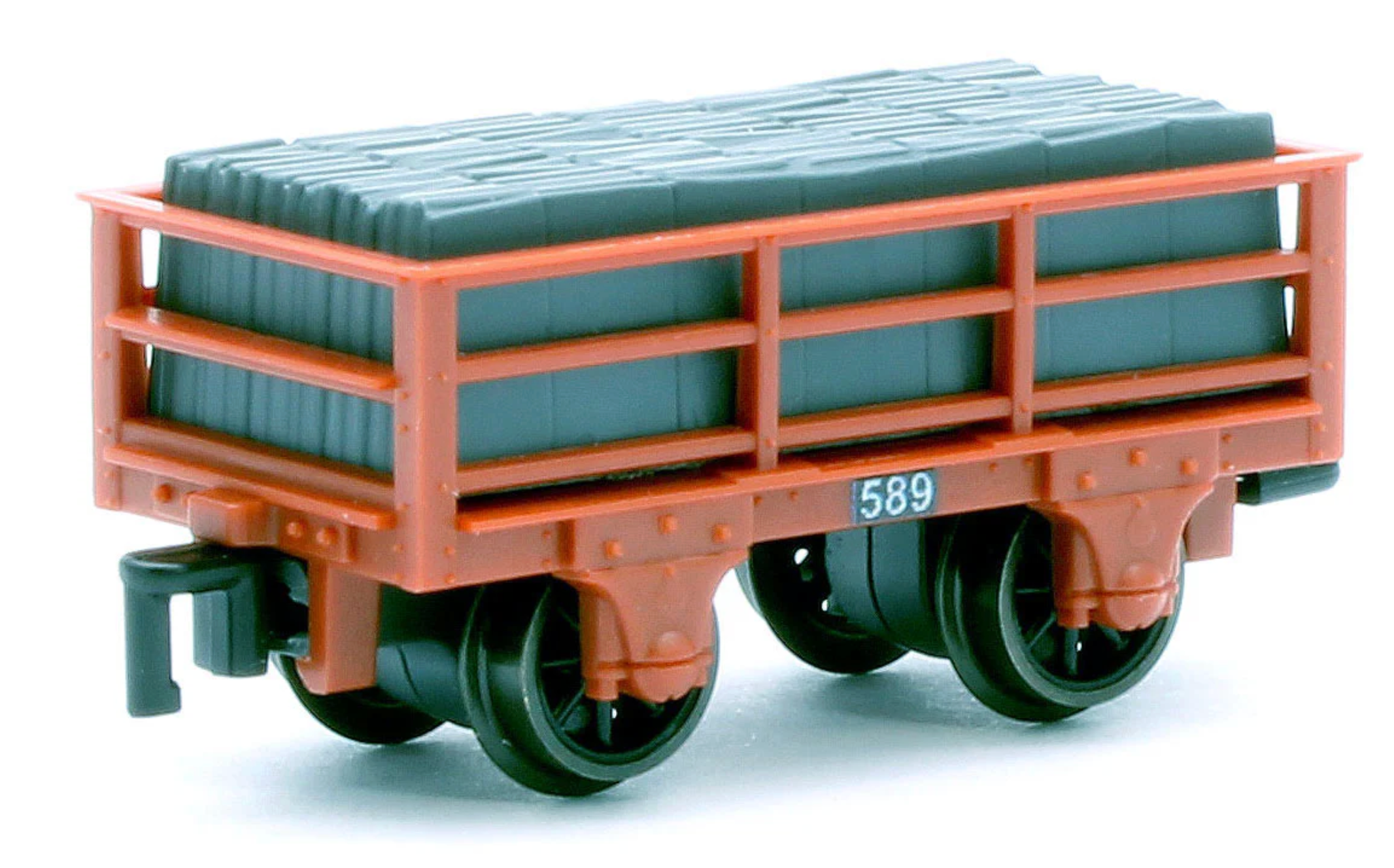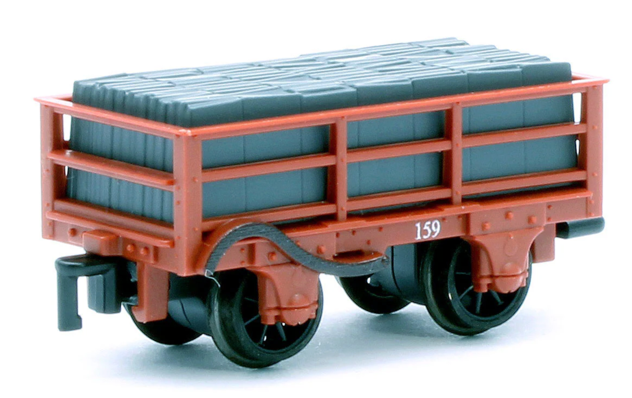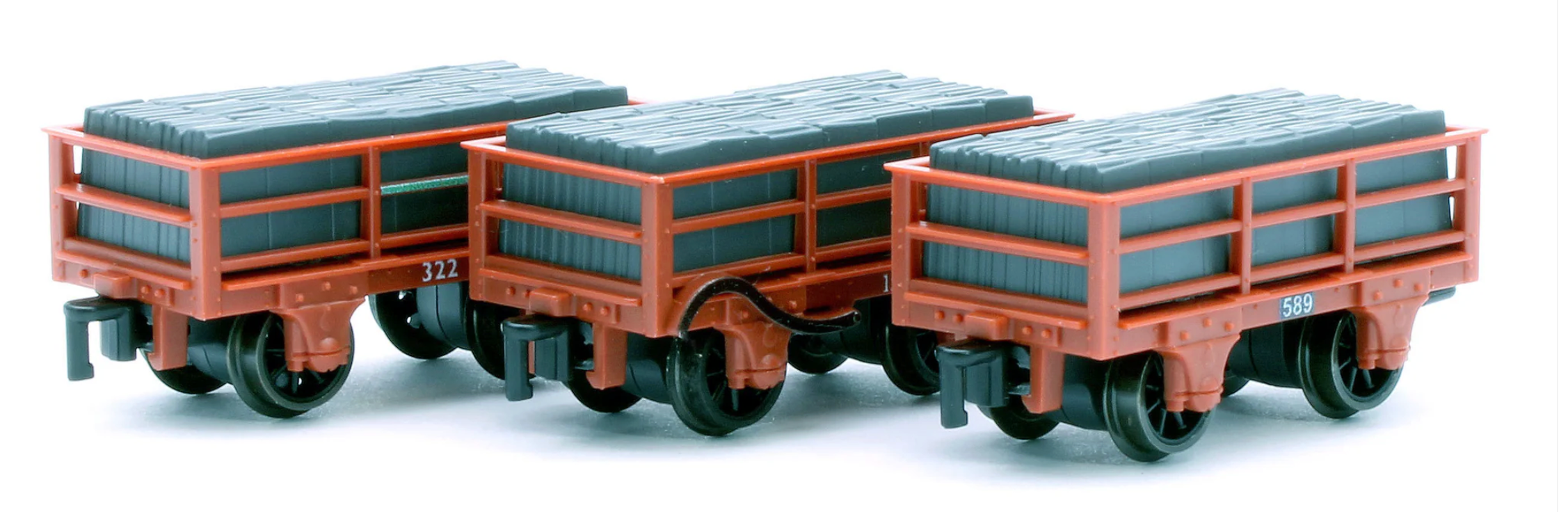 Trains of slate wagons used to be gravity run from the quarries at Blaenau Ffestiniog to the harbour at Porthmadoc, this model pack of 3 ready to run wagons includes 1 braked vehicle and removable slate loads which are conveniently hollow, thus giving the modeller the added option of including some further weight if required.