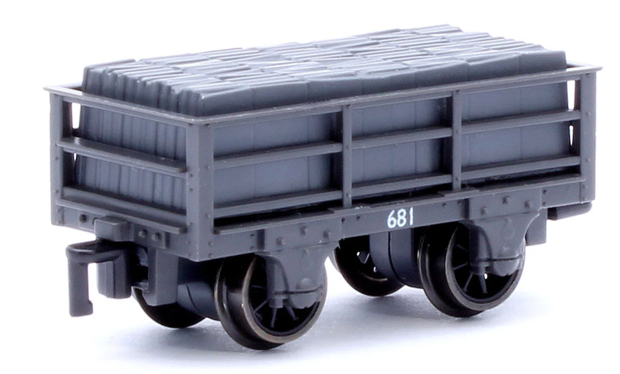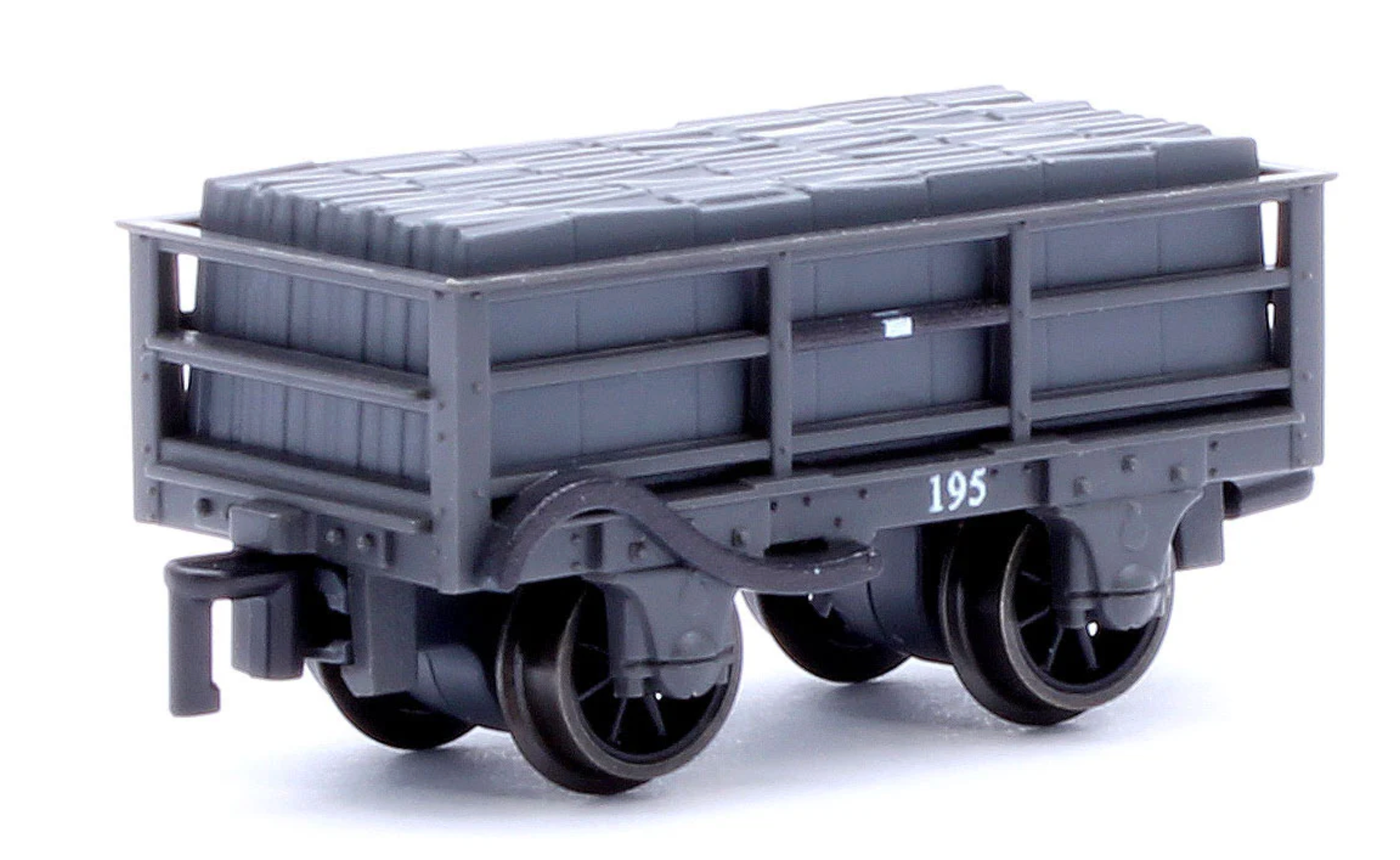 Trains of slate wagons used to be gravity run from the quarries at Blaenau Ffestiniog to the harbour at Porthmadoc, this model pack of 3 ready to run wagons includes 1 braked vehicle and removable slate loads which are conveniently hollow, thus giving the modeller the added option of including some further weight if required.