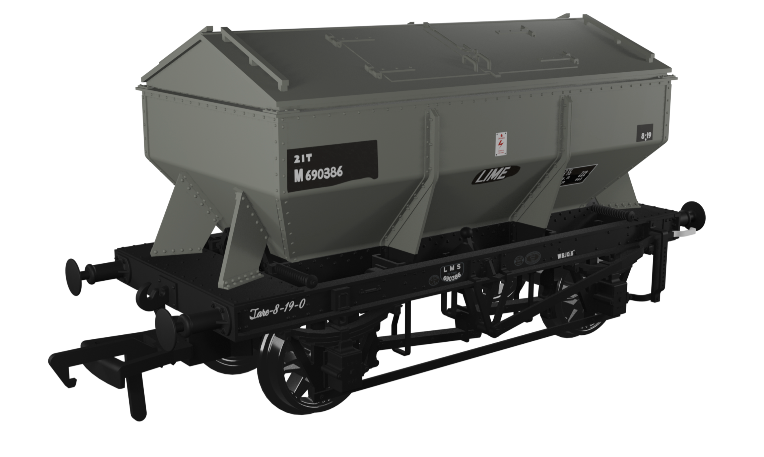 LMS Iron Ore Hopper BR (Lime) LMS 20t HopperBR Grey (Lime) No. M690386Lime hood fittedStraight buffer shanksSplit-spoke wheels running in metal bearingsHigh level of detail above and below the floor lineHigh...