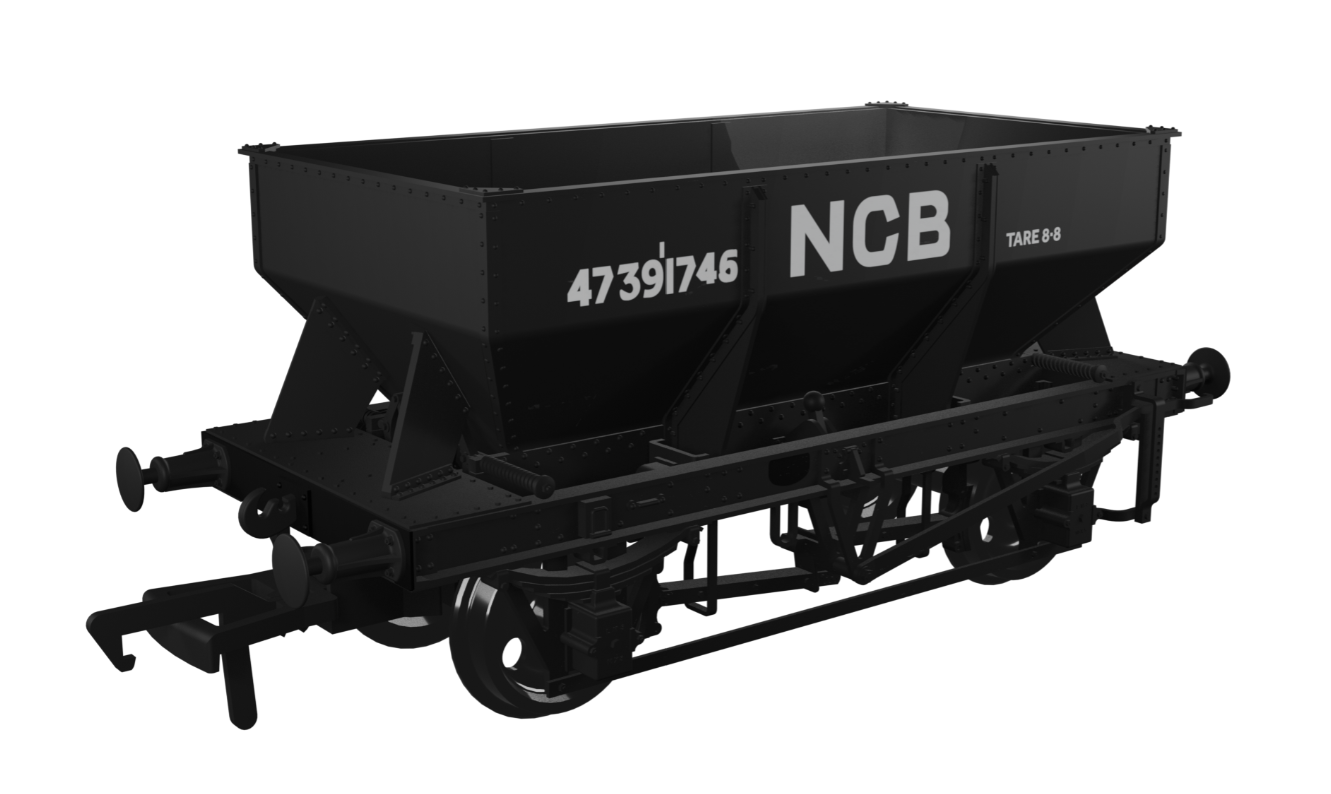 LMS Iron Ore Hopper NCB No.47391746 LMS 20t HopperNCB black No. 47391746Ribbed buffer shanksDisc wheels running in metal bearingsHigh level of detail above and below the floor lineHigh quality livery applicationNEM...