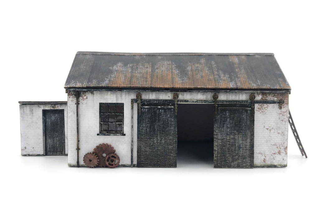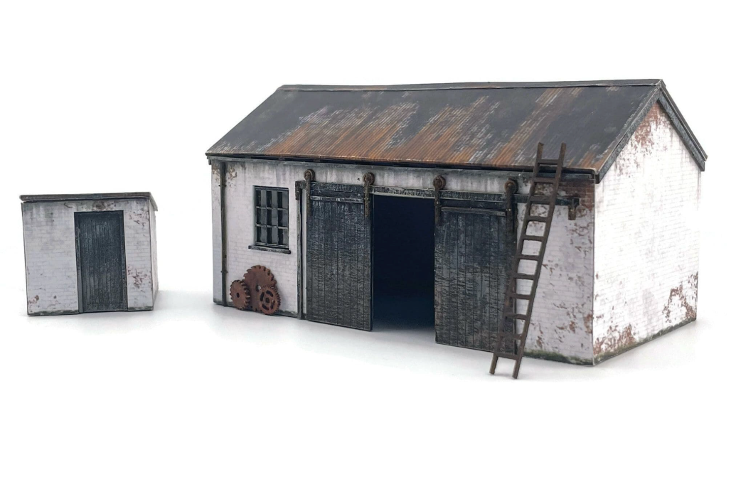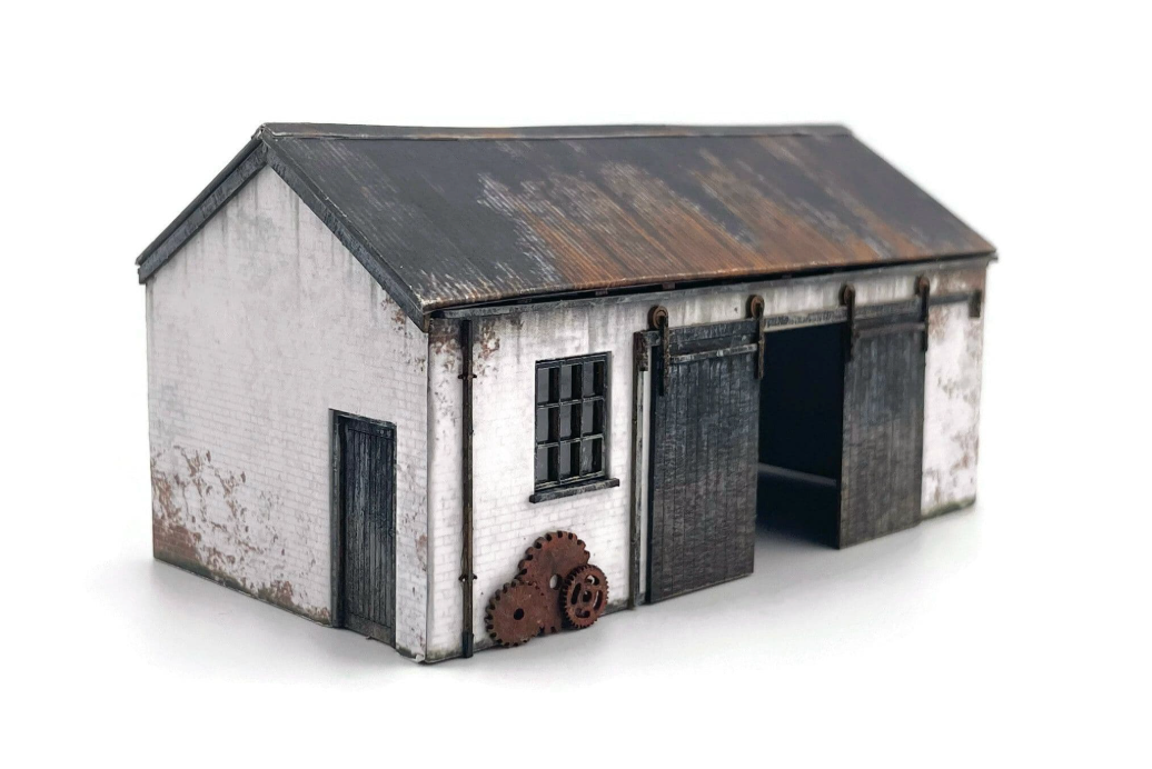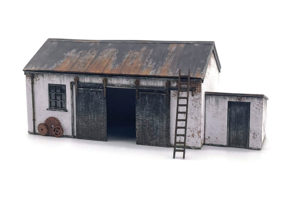 A versatile cart shed / workshop building suitable for farm, coastal, railway or industrial use. The design is typical of many buildings of this type that can still be seen all over the British Isles and is supplied with a choice of white painted red brick & whitewashed stone walls. Both finishes feature plenty of weathering for a worn & well-used finish.