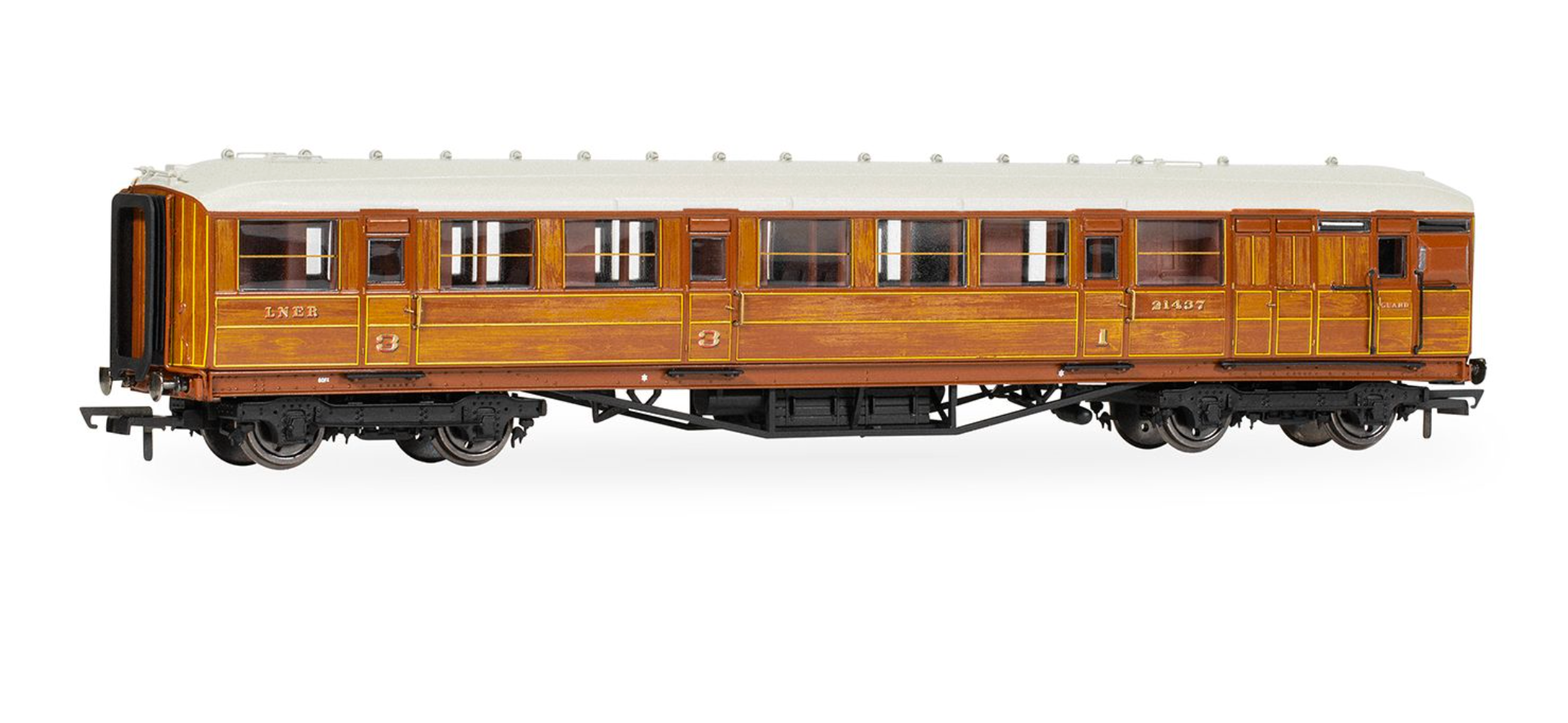This highly detailed Gresley Corridor third-class Brake coach is presented in a varnished teak finish with printed decoration including the LNER branding, numbers ‘3’ and ‘1’ on the doors to mark the class of the compartment and its unique number 21437. The model has detail underneath and metal wheels for finer running.