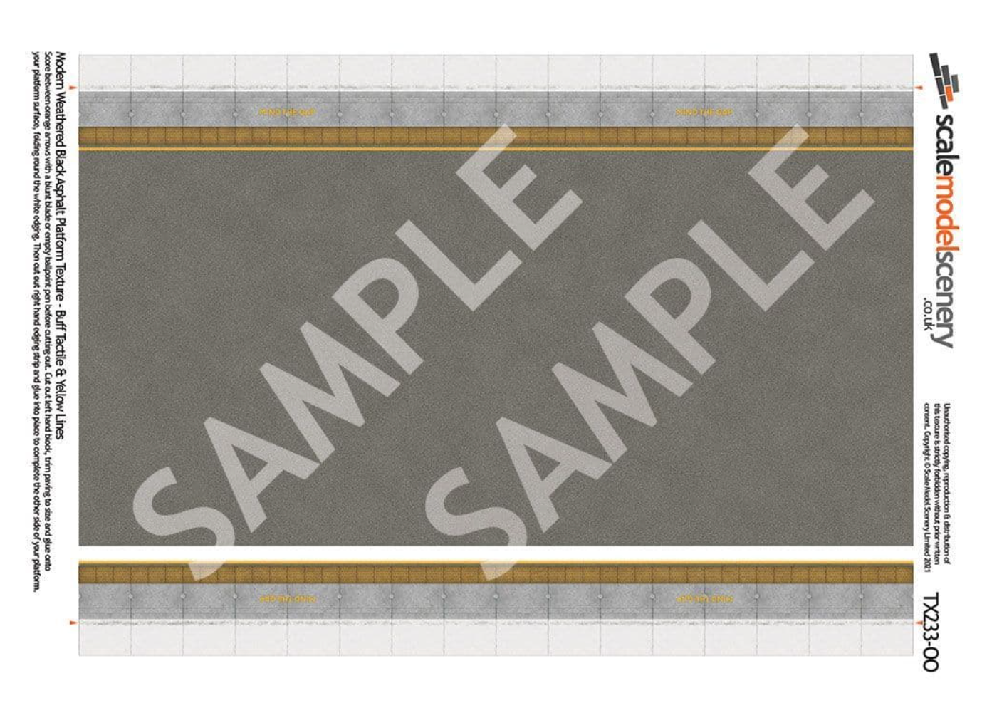 A pack of 5 A4 sheets (210mm x 297mm) of photo-realistic asphalt platform surface with Network Rail coping, yellow/buff tactile paving, yellow line & Mind The Gap markings. Ideal for use when scratch-building model railway station platforms. Can be cut to any size to suit your project. Perfect for all modern image OO scale model railway layouts and 1:76 diecast dioramas. Professionally printed in-house onto high quality matt white paper using a digital press. Can be easily cut to size and glued onto your chosen surface (MDF, card, plywood etc) using thinned PVA, Spray Mount, PVA or double-sided tape.