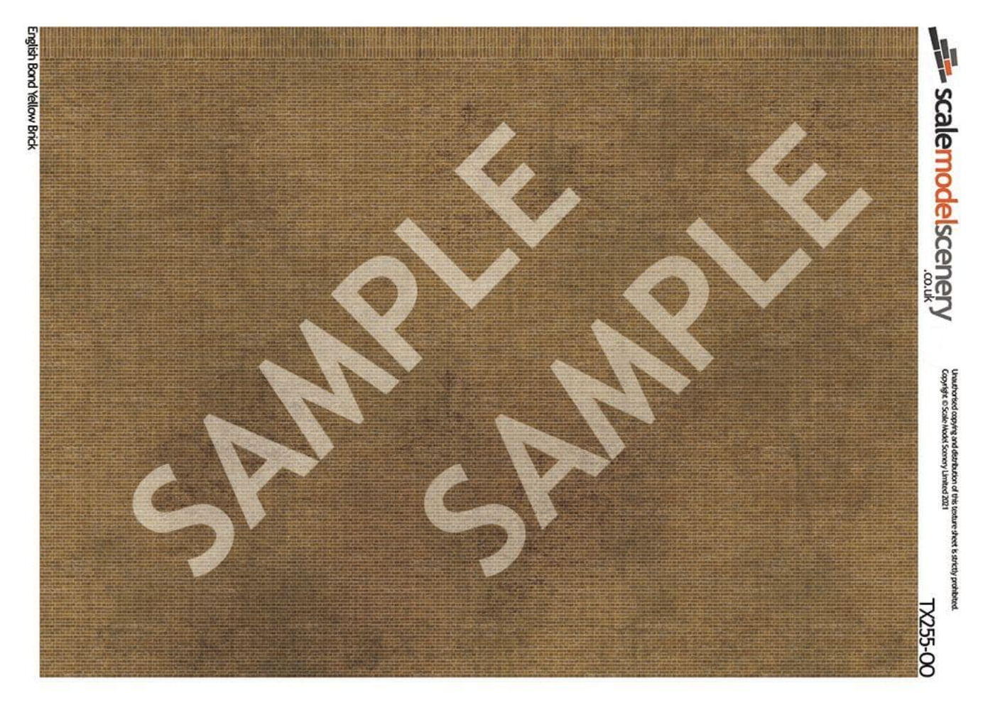 A pack of 5 A4 sheets (210mm x 297mm) of photo-realistic, pre-weathered English Bond Yellow Brick paper sheet. Ideal for scratch-building architecture on your OO scale model railway and 1:76 diecast dioramas. This texture matches the brick used on our platforms.