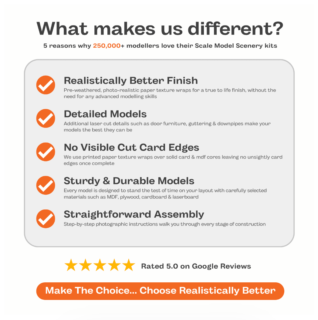 We've taken the very first kit we released just over 10 years ago and completely rebuilt it from the ground up, using all of the new materials we have access to, and the techniques we've developed over the years. Now with layered laser cut windows, brand-new, hand-rendered photorealistic wall textures and pre-weathered roof slates, the KX120-OO Victorian Ale House/Country Pub kit in OO scale will be a real talking point on your layout. This is a kit for the real enthusiast that loves the experience of building kits to detail their layouts.