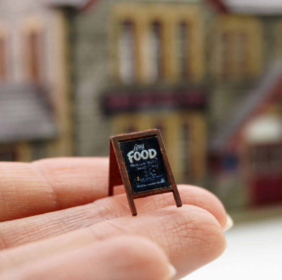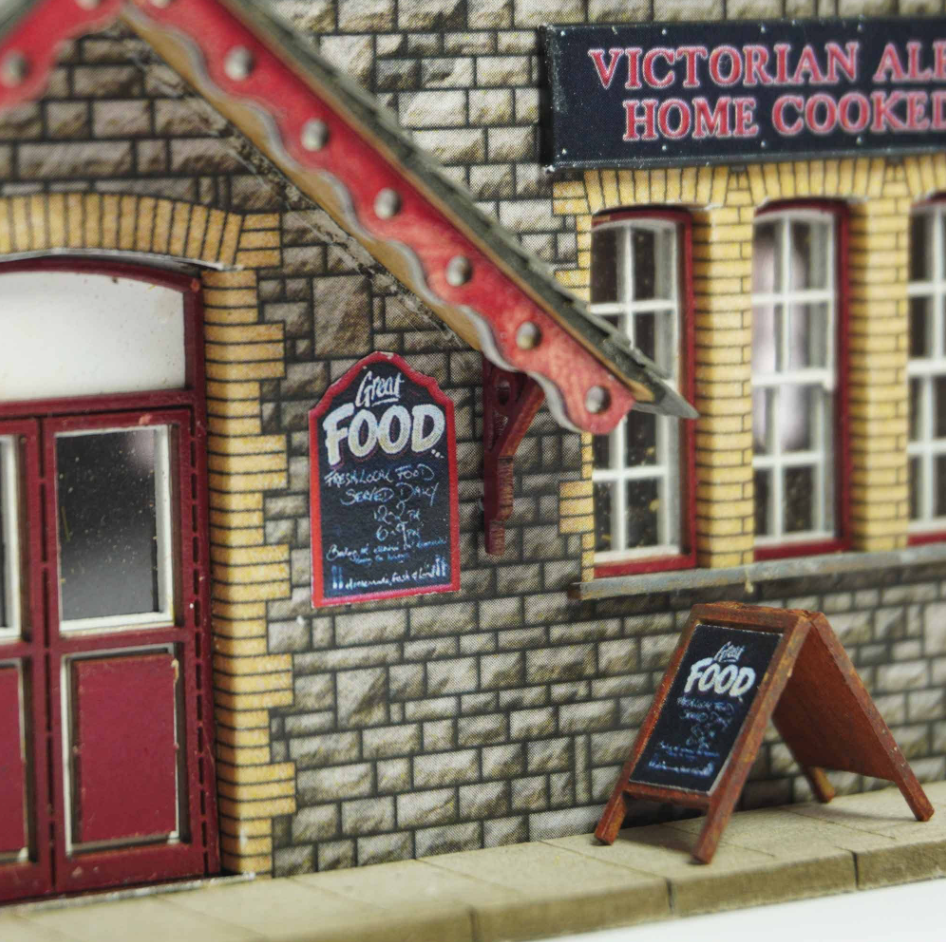 The doors on all of the buildings can be posed open, closed or anywhere in between, and feature engraved, layered detail. There's also a selection of wall and door signage to add that extra finishing touch, including a pavement board advertising home-cooked food.
