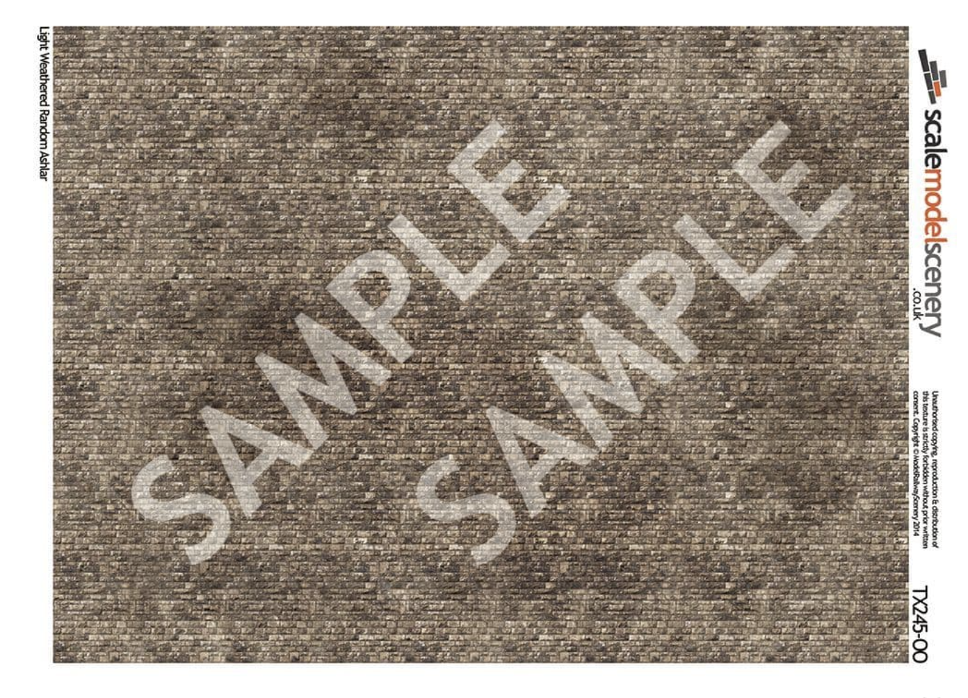 A pack of 5 A4 sheets (210mm x 297mm) of photo-realistic light weathered random stone ashlars brick paper. Ideal for use when scratch-building model railway station platforms, warehouses, goods sheds, factories & station buildings. Perfect for all steam era OO scale model railway layouts and 1:76 diecast dioramas onwards.