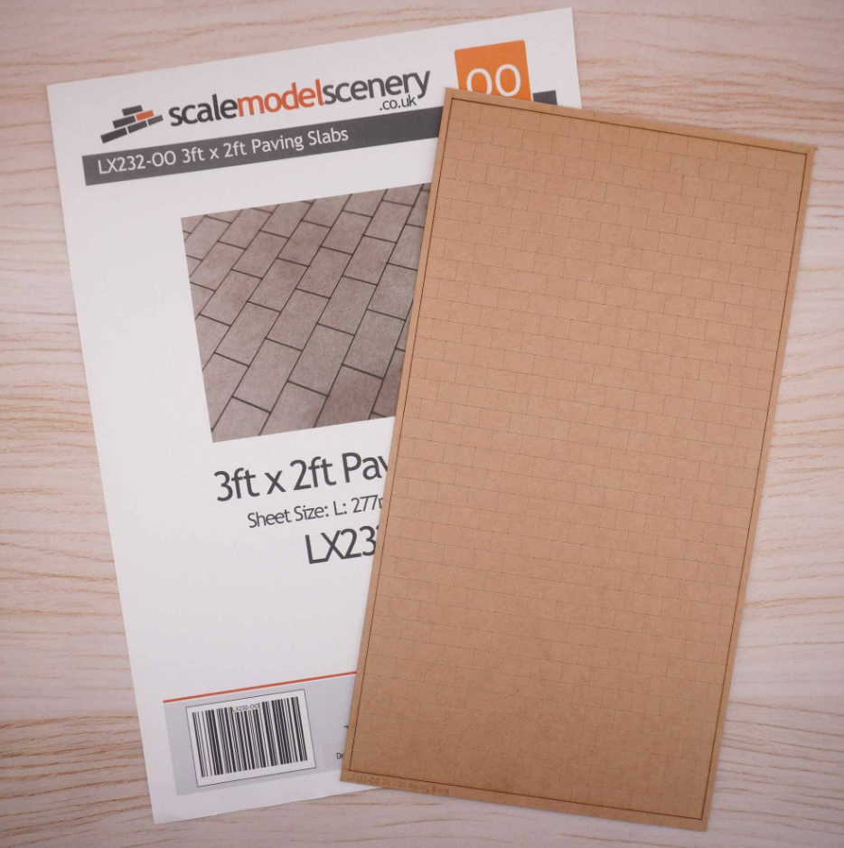 A quick and easy way to create a slabbed pavement, patio or pedestrian area on your layout with a 3ft x 2ft paving slab effect. Can be easily painted and weathered with acrylic brush or spray paints and weathering powders etc. Also suitable for use with our LX213-OO Platform Edging.