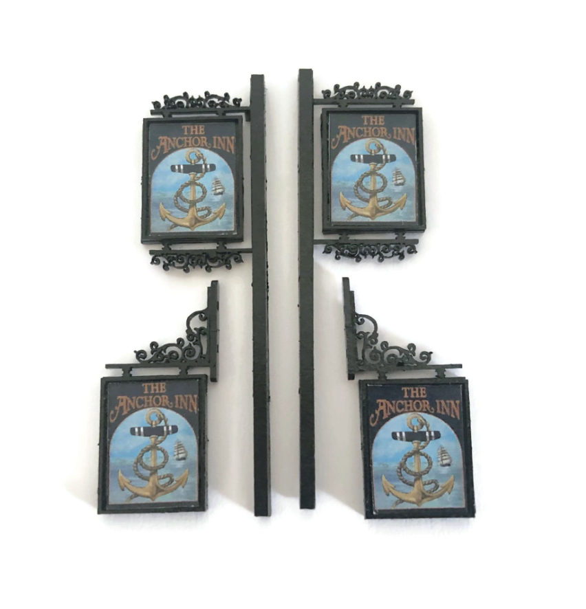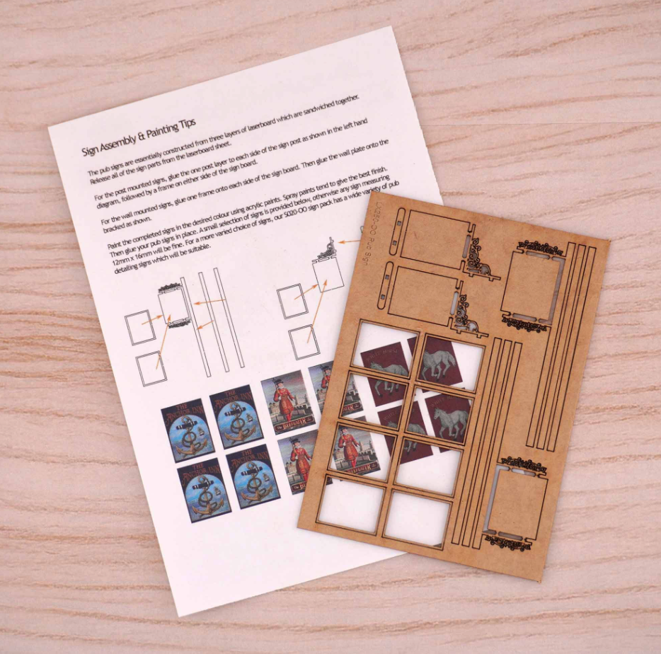 An easy to build kit making 4 laser cut signs for detailing the pubs and taverns on your layout. The kit builds two wall mounted & large post mounted signs with ornate wrought iron filigree decoration. A small selection of pub sign boards are included to decorate the signs. A wider choice of signage to compliment this kit can be found on our S020-OO Public House Signs sheet.